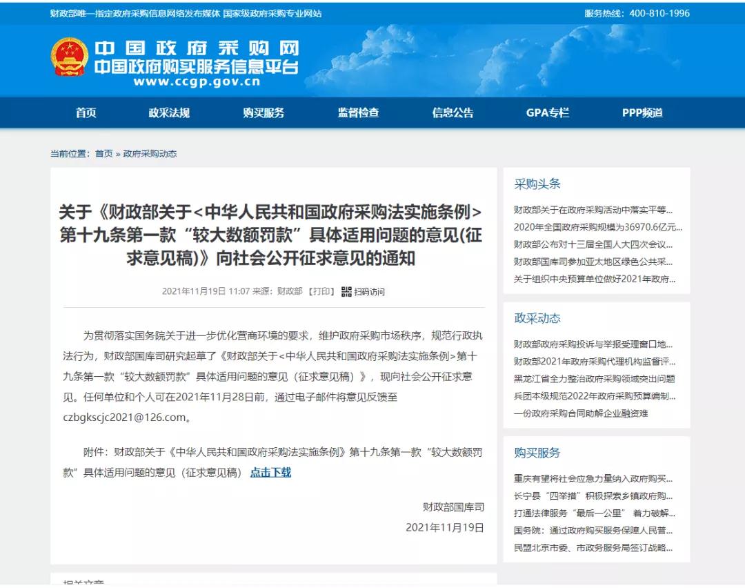 關(guān)于《財政部關(guān)于<中華人民共和國政府采購法實施條例>第十九條第一款“較大數(shù)額罰款”具體適用問題的意見(征求意見稿)》向社會公開征求意見的通知