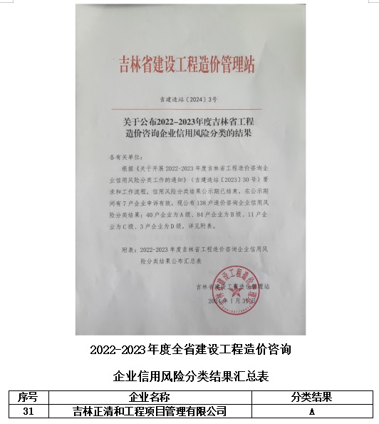 2022-2023年度吉林省建設工程造價咨詢企業(yè)信用風險分類A級 2022-2023年度吉林省建設工程造價咨詢企業(yè)信用風險分類A級 上一篇:2023-2024年度全省工程造價咨詢企業(yè)信用風險分類A級 下一篇:2021-2022年度吉林省建設工程造價咨詢企業(yè)信用評價A級