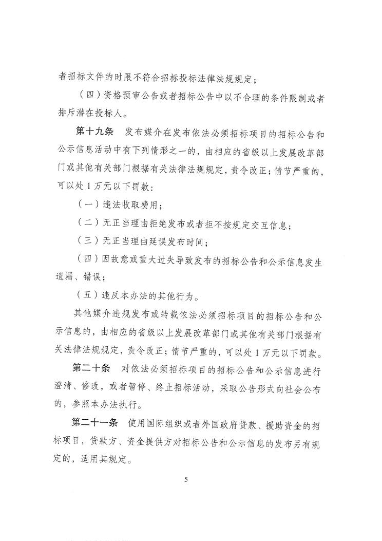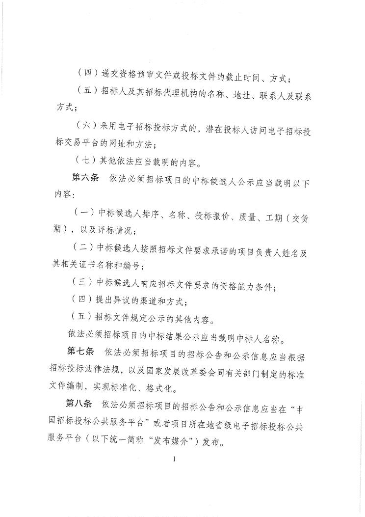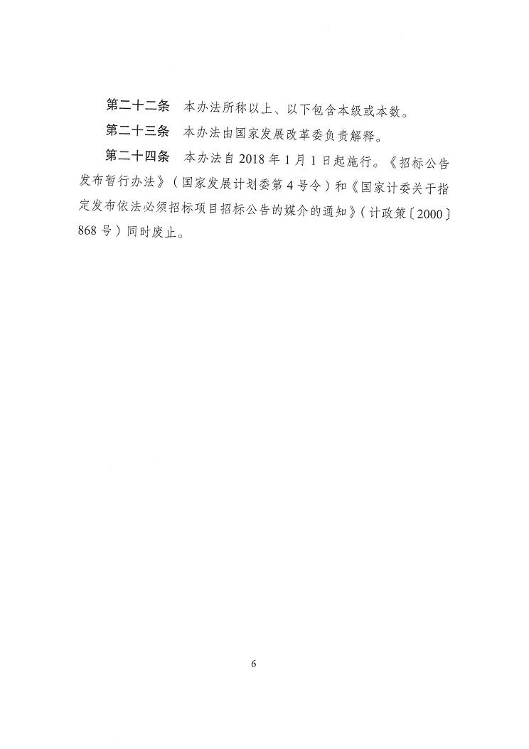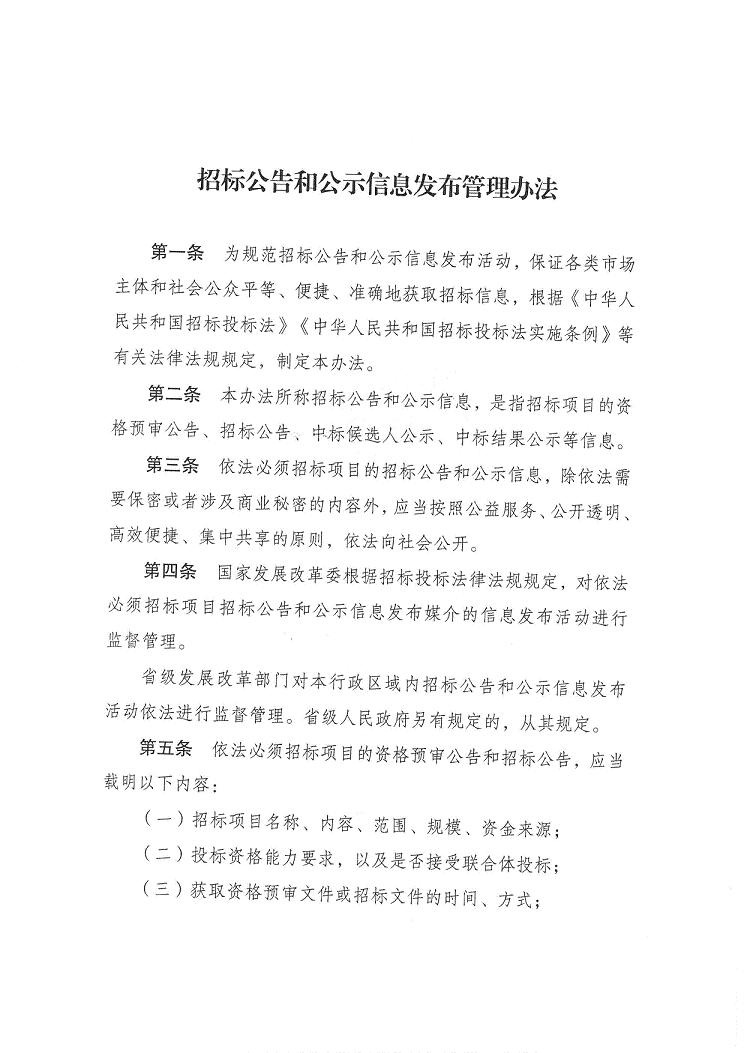 為規(guī)范招標(biāo)公告和公示信息發(fā)布活動(dòng),進(jìn)一步增強(qiáng)招標(biāo)投標(biāo)透明度,保障公平競(jìng)爭(zhēng)市場(chǎng)秩序,我們制定了《招標(biāo)公告和公示信息發(fā)布管理辦法》,現(xiàn)予印發(fā),自2018年1月1日起施行。